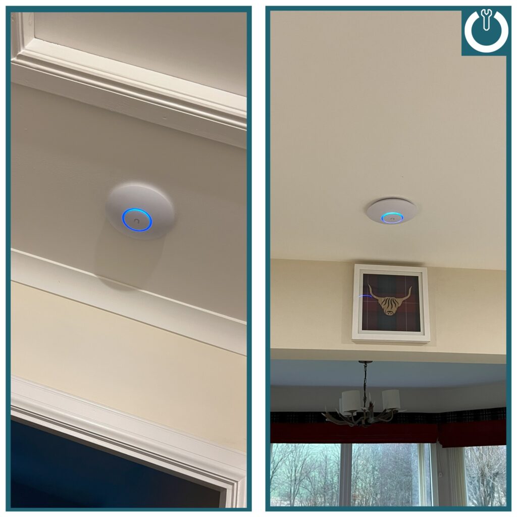 The Access points AJ Tech Repair use are typically set up with minimal cabling because they are powered using Power over Ethernet (PoE). A switch is installed in the network, and each access point connects to the switch with a single Ethernet cable that provides both data transfer and power. This eliminates the need for multiple cables, making the setup cleaner and easier to manage, while ensuring reliable connectivity and power supply for each access point.